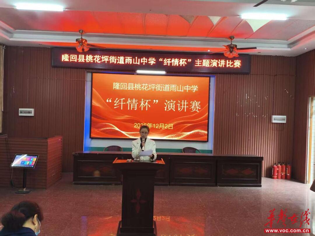 華聲在線12月2日訊(通訊員 陸浩 馬小麗 謝小玉 黃軍菊)為弘揚革命精神,厚植愛國情懷,12月2日,隆回縣桃花坪街道雨山中學舉行“纖情杯”紅色主題演講比賽決賽。經過前期選拔,共20名優秀選手登上了決賽舞臺。