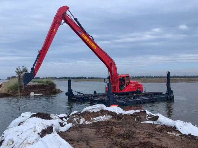 該水陸兩棲挖掘機適用于抗洪搶險與水上工程救援場景,具備船舶般的漂浮與自航能力,可直接在水面上作業。該設備浮力超60噸,航速達7公里/小時,并搭載智能化控制系統與遠程遙控功能;采用伸縮式浮箱底盤,能快速自主上下運輸車輛,顯著提升轉場效率。可配備鏟斗、破碎錘、清淤泵等多種工具頭,實現一機多能。