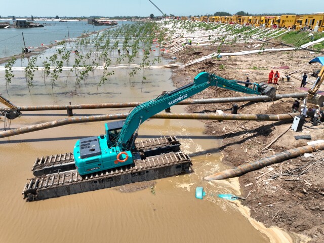 (山河智能研制的新型水陸兩棲挖掘機正在作業。圖源山河智能。)